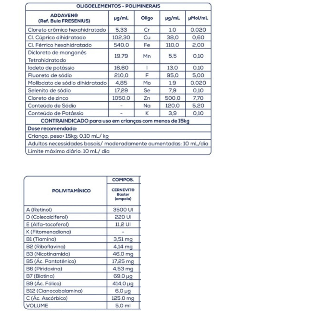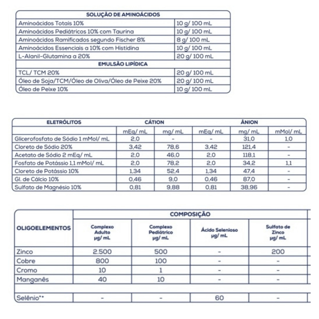 - A NP pode ser composta por macronutrientes (aminoácidos – Aa, glicose e emulsão lipídica – EL) e micronutrientes (vitaminas, oligoelementos e eletrólitos). Cada nutriente é prescrito de acordo com as necessidades nutricionais individuais.